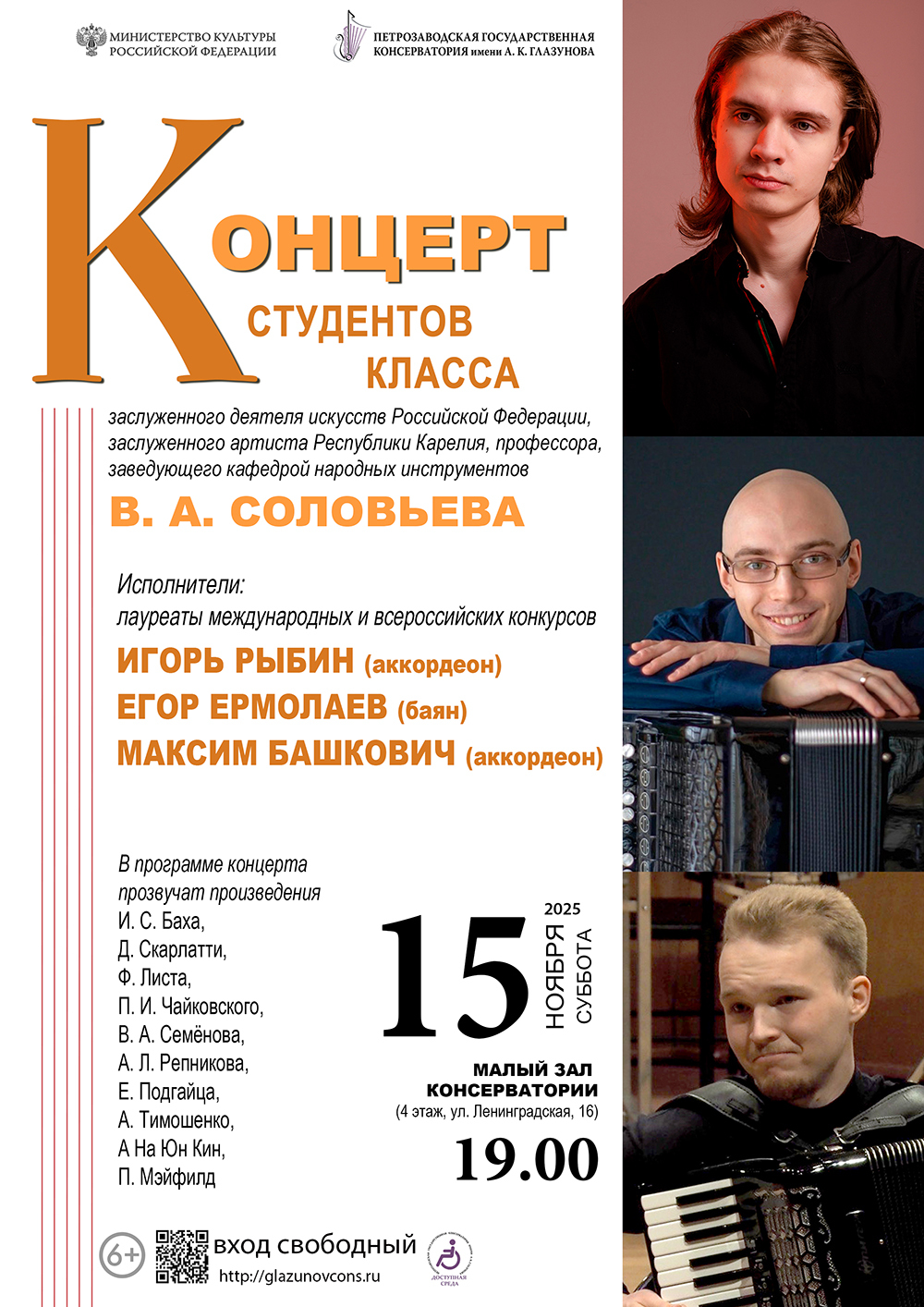 15 ноября 2025 года в 19.00 в Малом зале консерватории (ул. Ленинградская, 16, 4 этаж) состоится концерт класса заслуженного деятеля искусств Российской Федерации, заслуженного артиста Республики Карелия, профессора, заведующего кафедрой народных инструментов В. А. Соловьева.