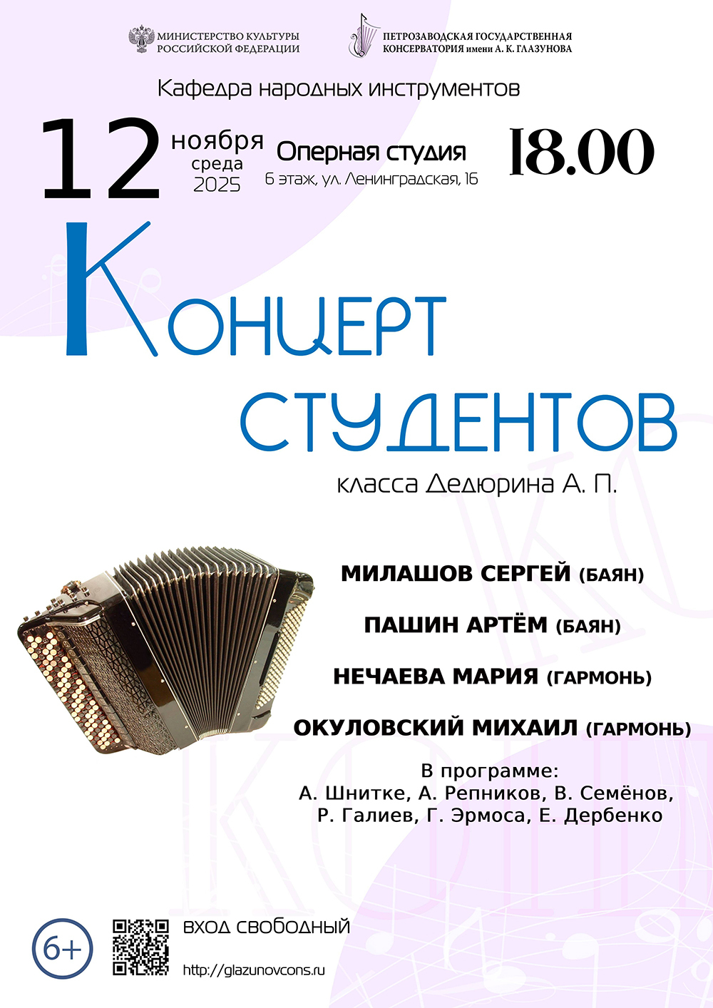 12 ноября 2025 года в 18.00 в Оперной студии консерватории (ул. Ленинградская, 16, 6 этаж) состоится концерт студентов класса Дедюрина А. П.