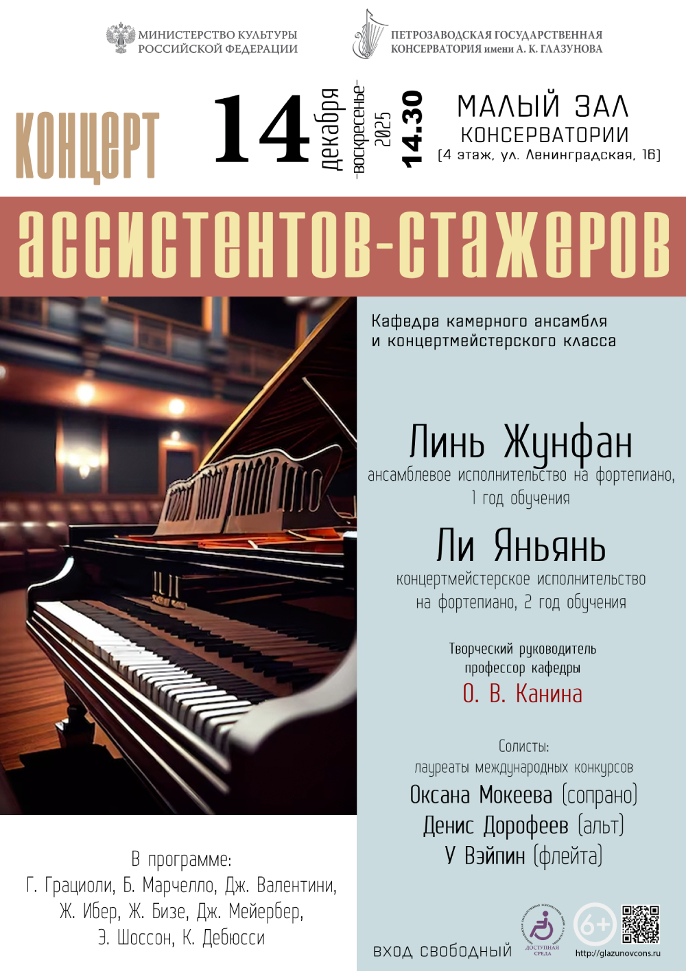 14 декабря 2025 года в 14.30 в Малом зале консерватории (ул. Ленинградская, 16, 4 этаж) кафедра камерного ансамбля и концертмейстерского класса представит концерт ассистентов-стажеров.