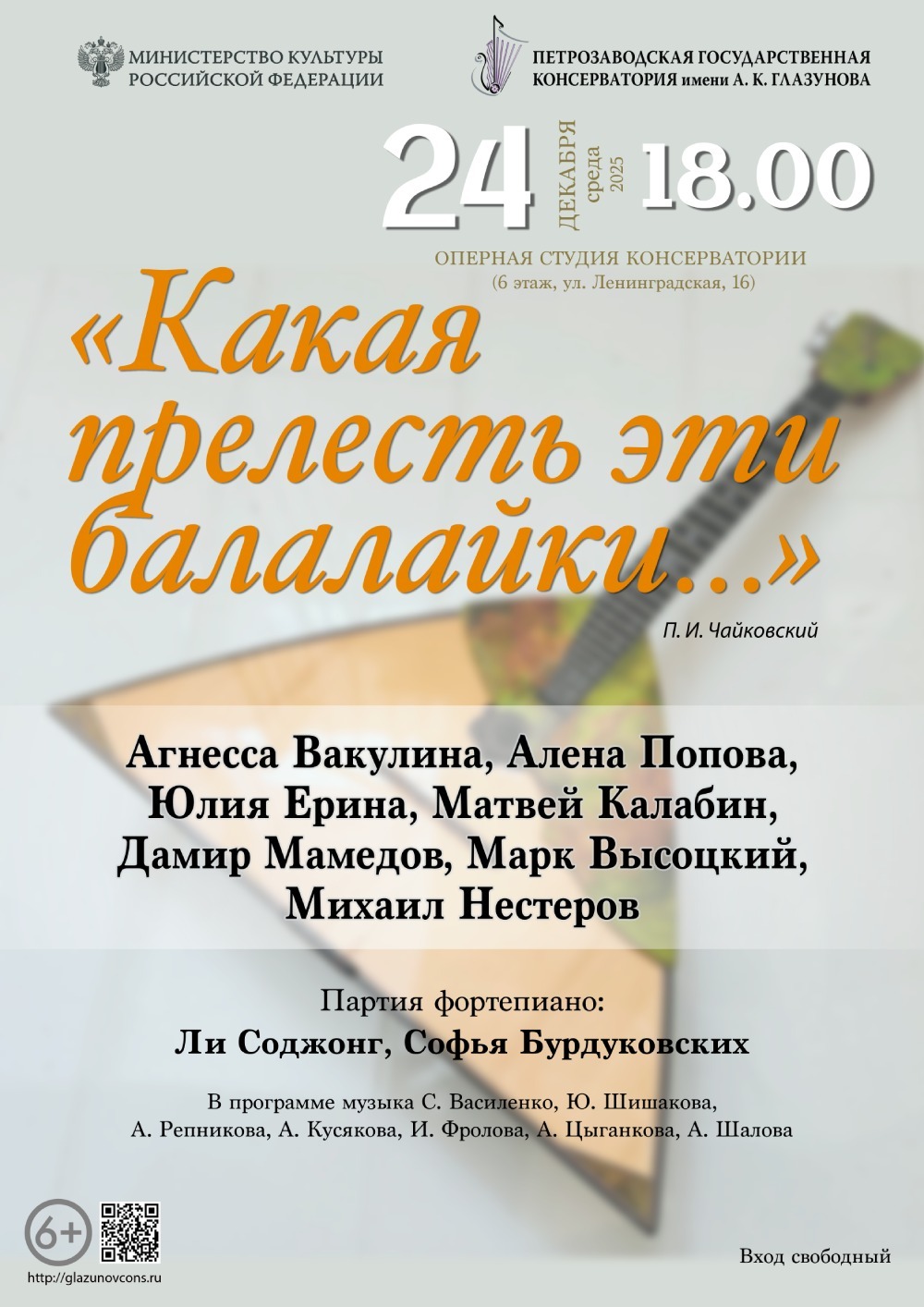 24 декабря 2025 года в 18.00 в Оперной студии консерватории (ул. Ленинградская, 16, 6 этаж) состоится концерт «Какая прелесть эти балалайки...».