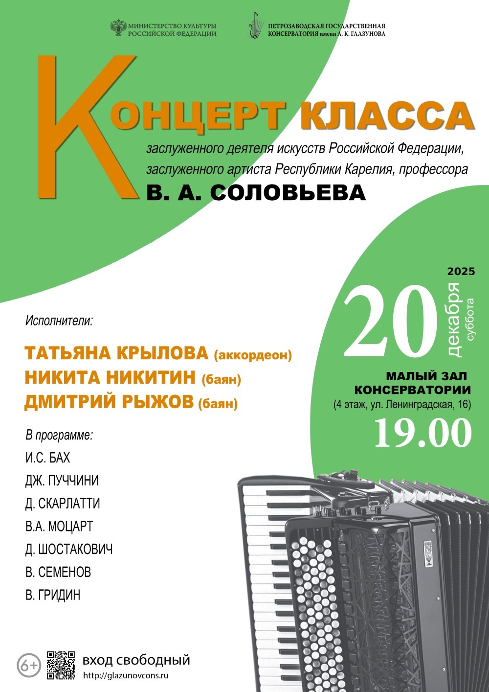 20 декабря 2025 года в 19.00 в Малом зале консерватории (ул. Ленинградская, 16, 4 этаж) состоится концерт класса заслуженного деятеля искусств Российской Федерации, заслуженного артиста Республики Карелия, профессора, заведующего кафедрой народных инструментов В. А. Соловьева.