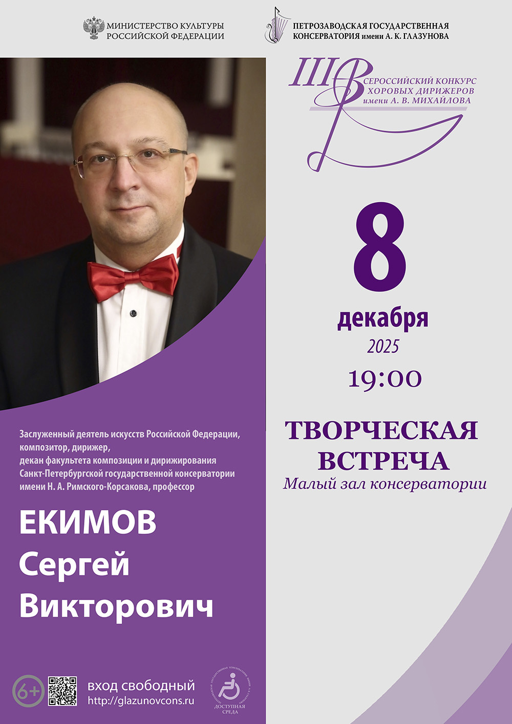 8 декабря 2025 года в 19.00 в Малом зале консерватории (ул. Ленинградская, 16, 4 этаж) пройдет творческая встреча с Сергеем Викторовичем Екимовым заслуженным деятелем искусств Российской Федерации, композитором, дирижером, деканом факультета композиции и дирижирования Санкт-Петербургской государственной консерватории имени Н.А. Римского-Корсакова, профессором.