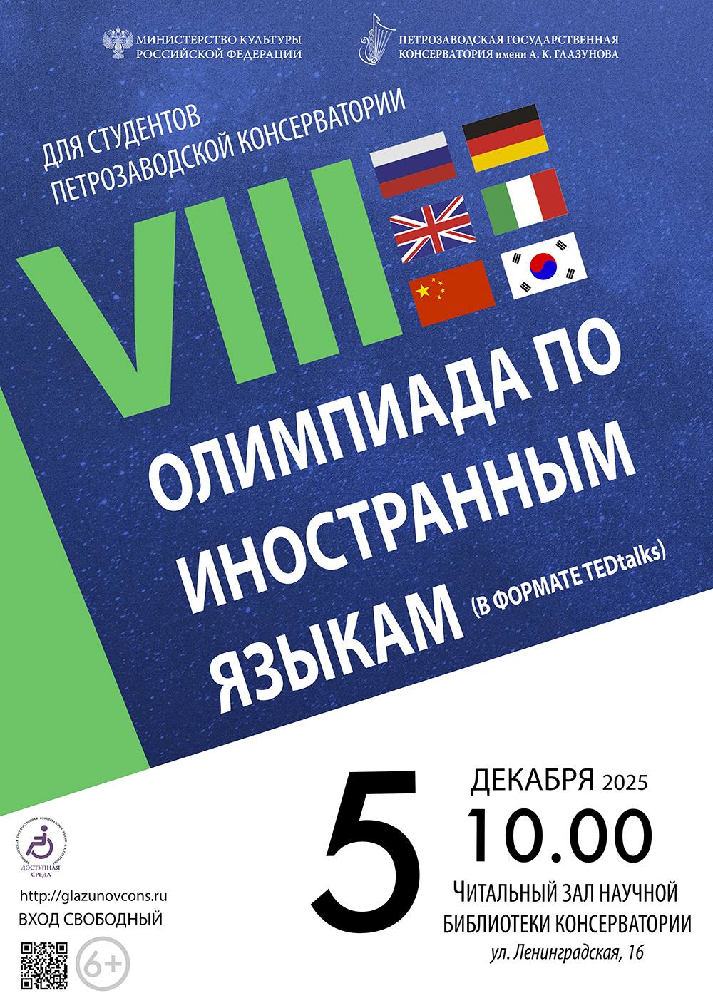 5 декабря 2025 года в 10.00 в Читальном зале Научной библиотеки Петрозаводской государственной консерватории имени А. К. Глазунова состоится VIII Олимпиада по иностранным языкам для студентов Петрозаводской консерватории (в формате TED talks).