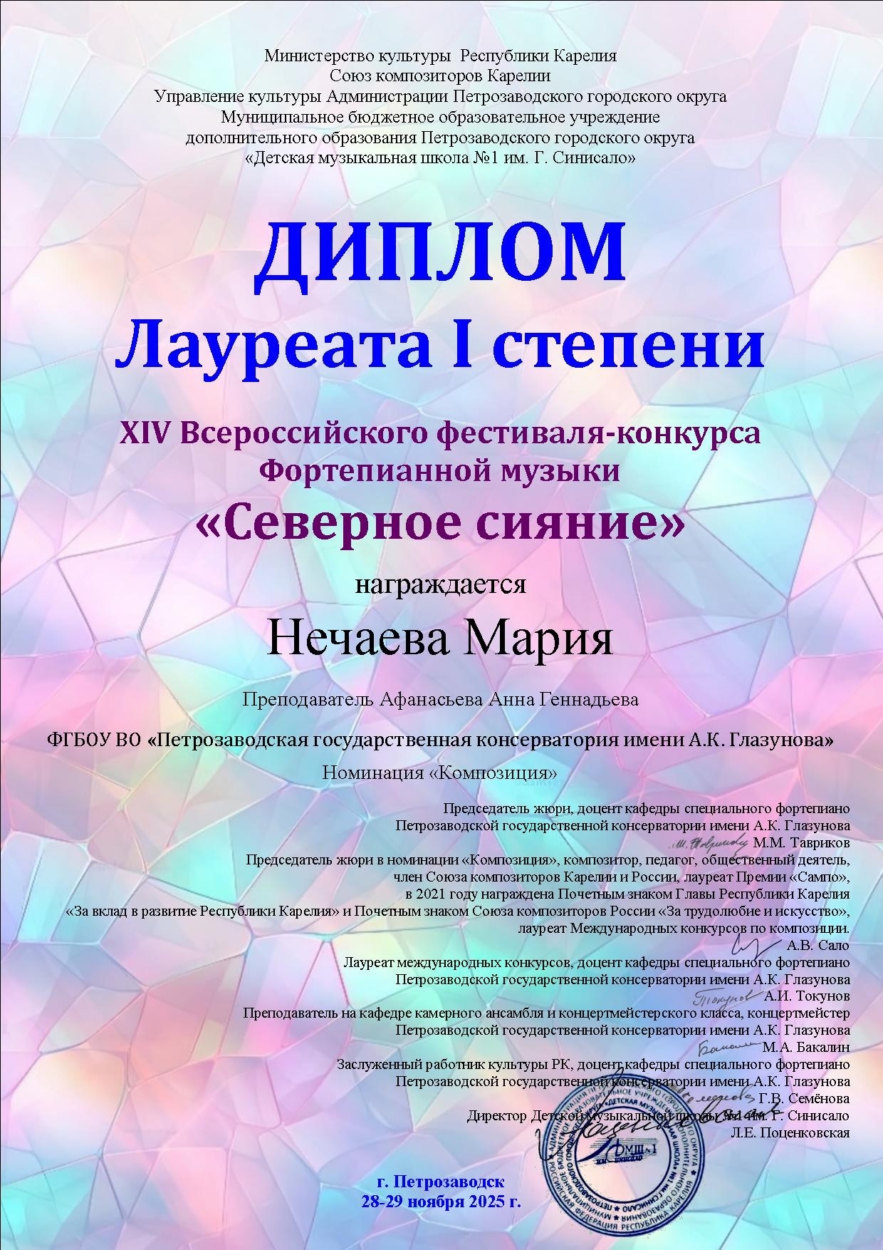 Поздравляем Марию Нечаеву, студентку кафедры теории музыки и композиции Петрозаводской государственной консерватории имени А. К. Глазунова (класс преподавателя Афанасьевой А.Г.), с победой (Лауреат I степени) на XIV Всероссийском фестивале-конкурсе фортепианной музыки «Северное сияние» в номинации «Композиция»!