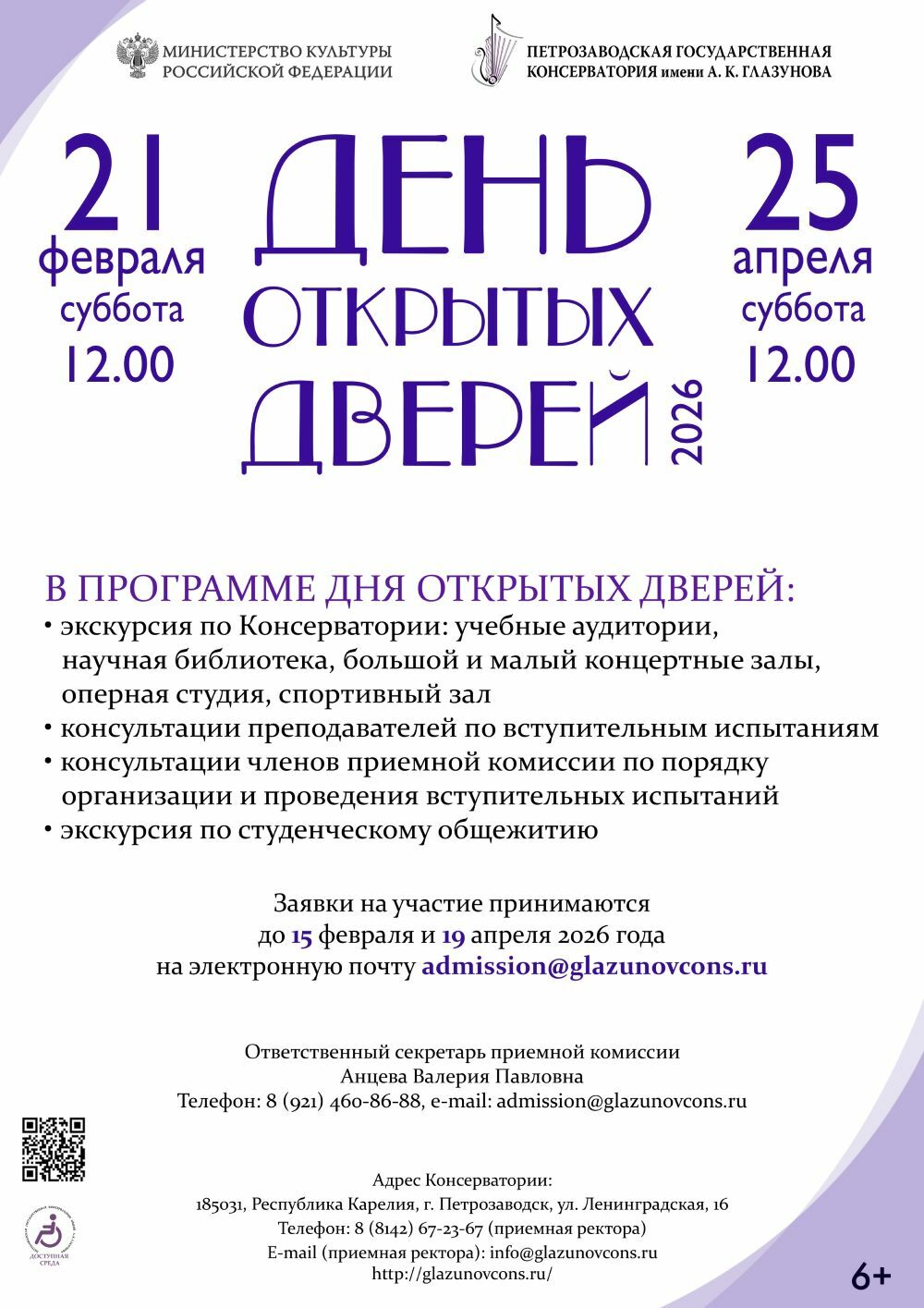 Петрозаводская государственная консерватория имени А.К. Глазунова приглашает на День открытых дверей 21 февраля и 25 апреля 2026 года в 12.00!