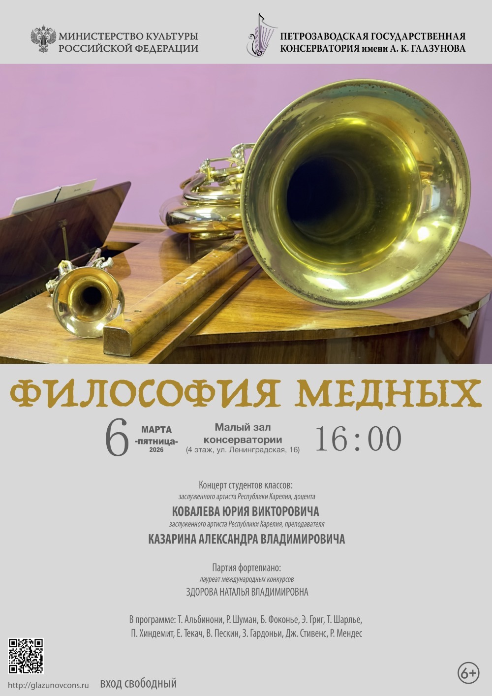 6 марта 2026 года в 16:00 в Малом зале консерватории (ул. Ленинградская, 16) состоится концерт студентов классов: заслуженного артиста Республики Карелия, доцента Ковалева Юрия Викторовича, заслуженного артиста Республики Карелия, преподавателя Казарина Александра Владимировича.