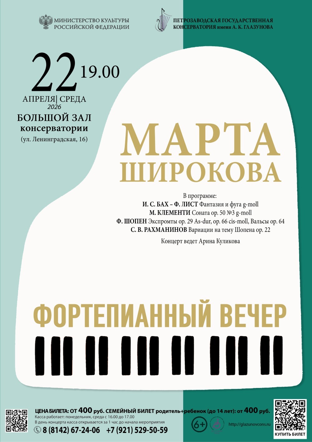 22 апреля в 19.00 в Большом зале консерватории состоится фортепианный вечер Марты Широковой.