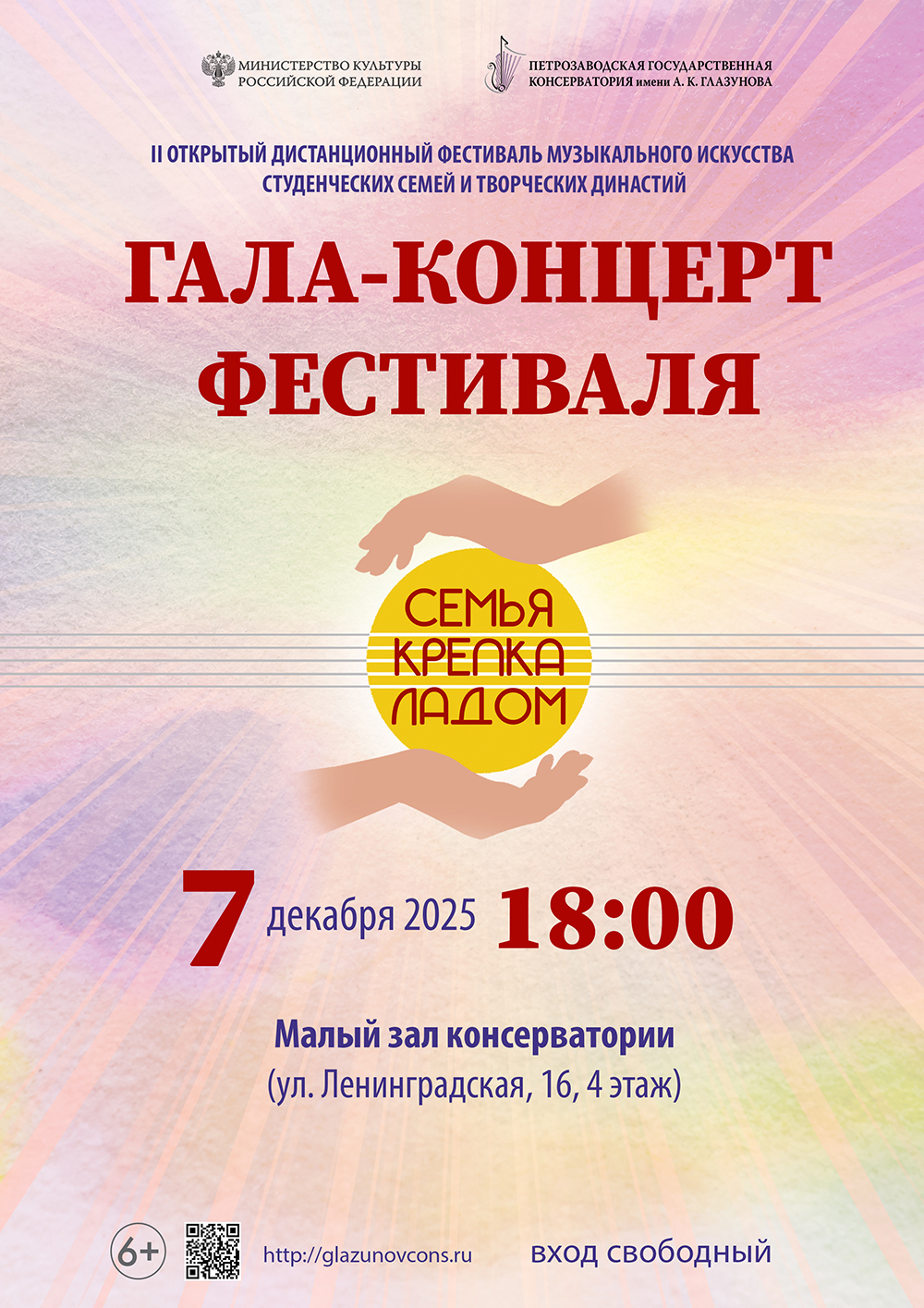 7 декабря 2025 года в 18.00 в Малом зале консерватории (4 этаж, ул. Ленинградская, 16) пройдет ГАЛА-КОНЦЕРТ II Открытого дистанционного фестиваля музыкального искусства студенческих семей и творческих династий.