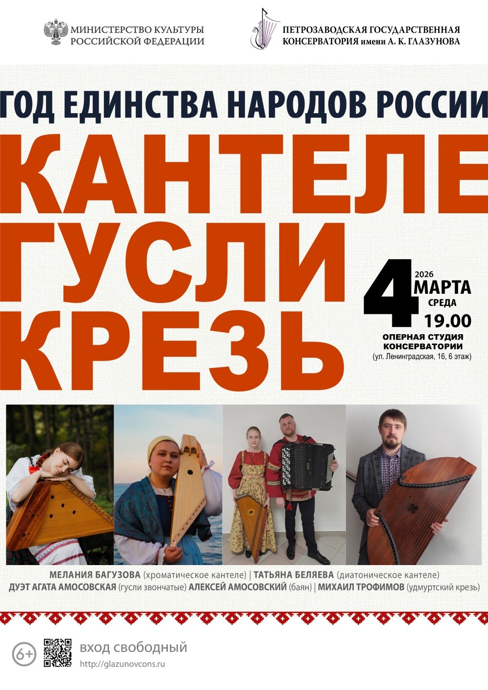 4 марта 2026 года в 19.00 в Оперной студии консерватории (ул. Ленинградская, 16, 6 этаж) состоится концерт «КАНТЕЛЕ. ГУСЛИ. КРЕЗЬ».