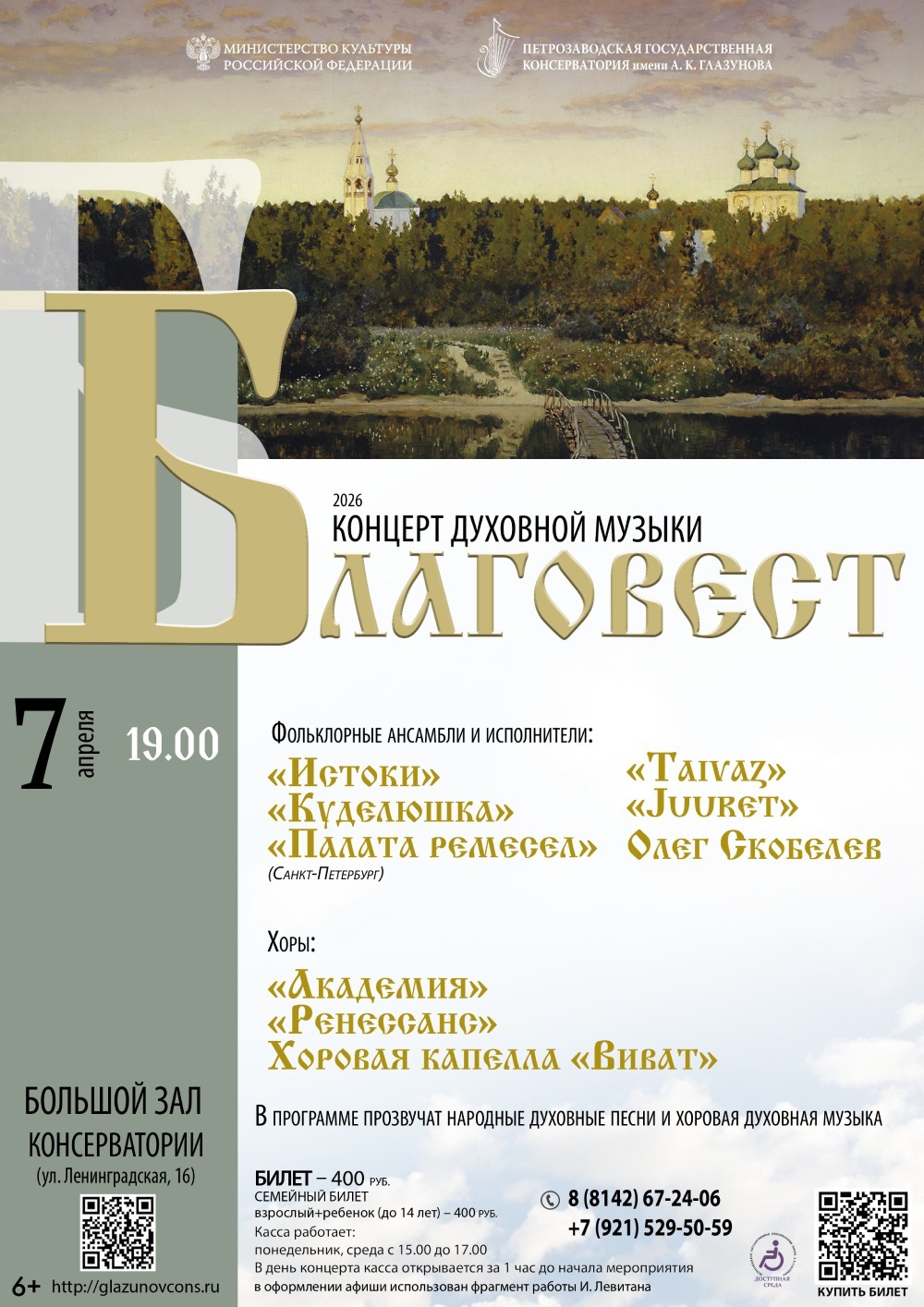7 апреля 2026 года в 19.00 в Большом зале консерватории (ул. Ленинградская, 16) состоится концерт концерт духовной музыки «Благовест».