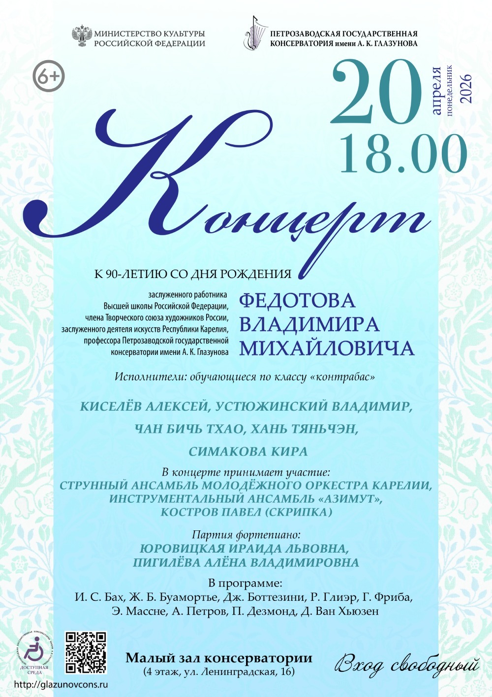 20 апреля 2026 года в 18.00 в Малом зале консерватории (ул. Ленинградская, 16, 4 этаж) состоится концерт к 90-летию со дня рождения Федотова Владимира Михайловича, заслуженного работника Высшей школы Российской Федерации, члена Творческого союза художников России, заслуженного деятеля искусств Республики Карелия, профессора Петрозаводской государственной консерватории имени А. К. Глазунова.