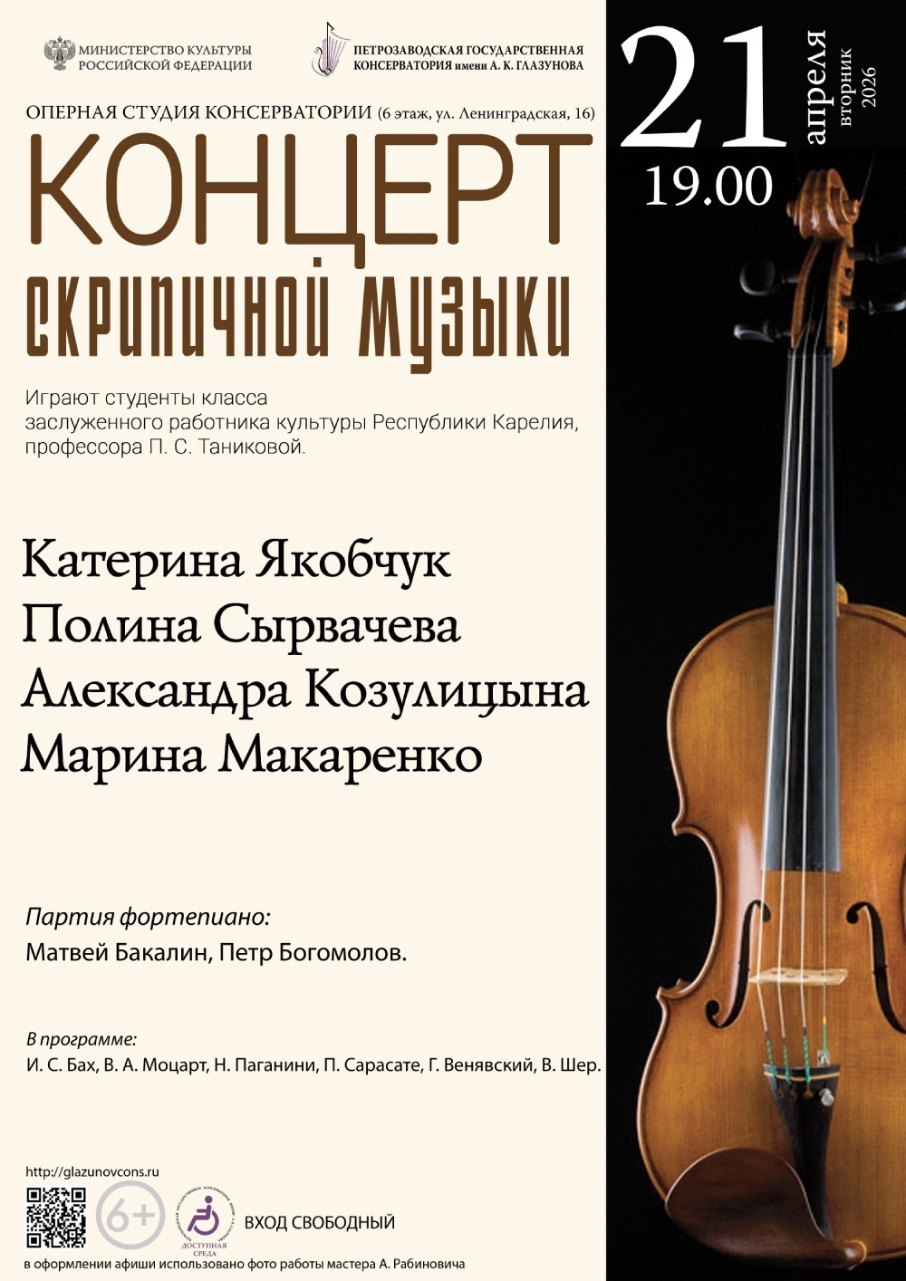 21 апреля 2026 года в 19.00 в Оперной студии консерватории (ул. Ленинградская, 16, 6 этаж) состоится концерт скрипичной музыки.