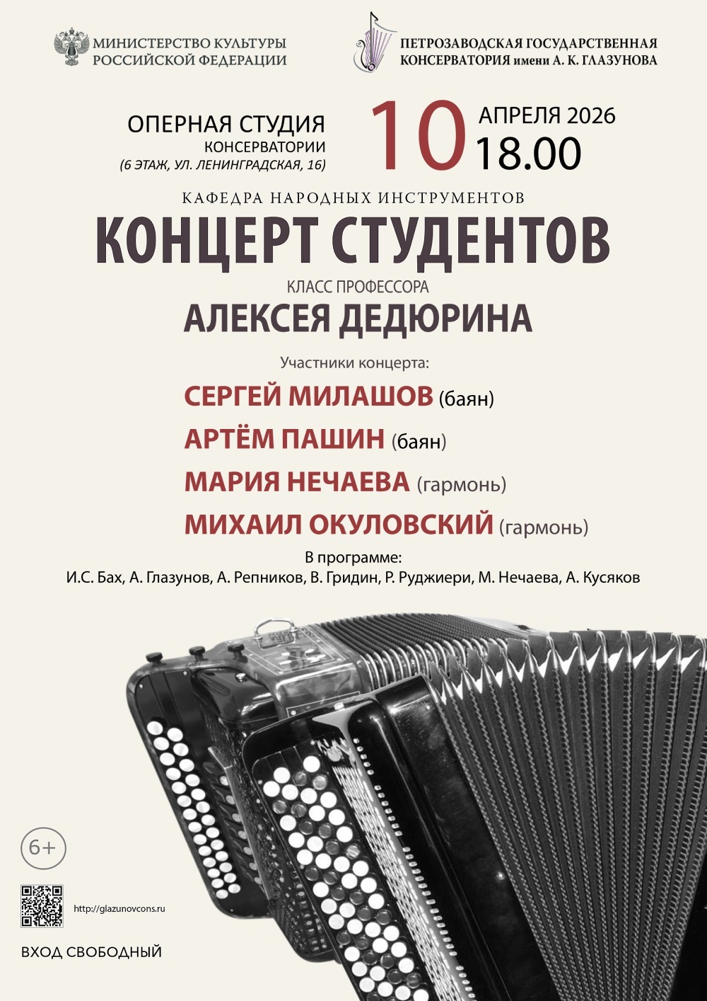 10 апреля 2026 года в 18.00 в Оперной студии консерватории (ул. Ленинградская, 16, 6 этаж) состоится концерт студентов класса профессора Дедюрина А. П.