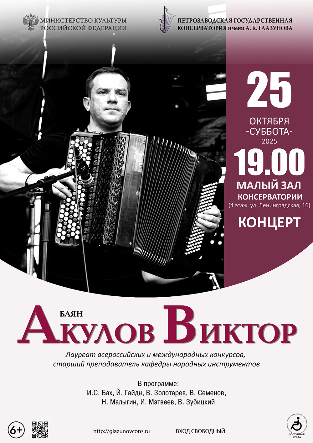 25 октября 2025 года в 19.00 в Малом зале консерватории (ул. Ленинградская, 16, 4 этаж) состоится концерт лауреата всероссийских и международных конкурсов, старшего преподавателя кафедры народных инструментов Виктора Акулова.