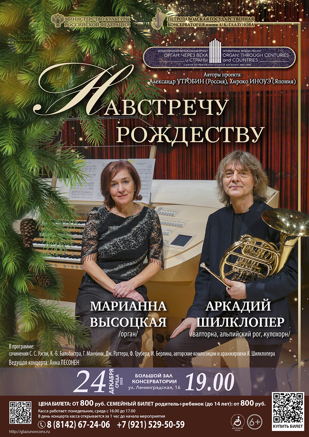 24 декабря 2025 года в 19.00 в Большом зале консерватории (ул. Ленинградская, 16) в рамках Международного музыкального проекта «Орган через века и страны» – серии вечеров органной музыки 2025/2026 – выступят Марианна Высоцкая /орган/ и Аркадий Шилклопер /валторна, альпийский рог, кулохорн/.