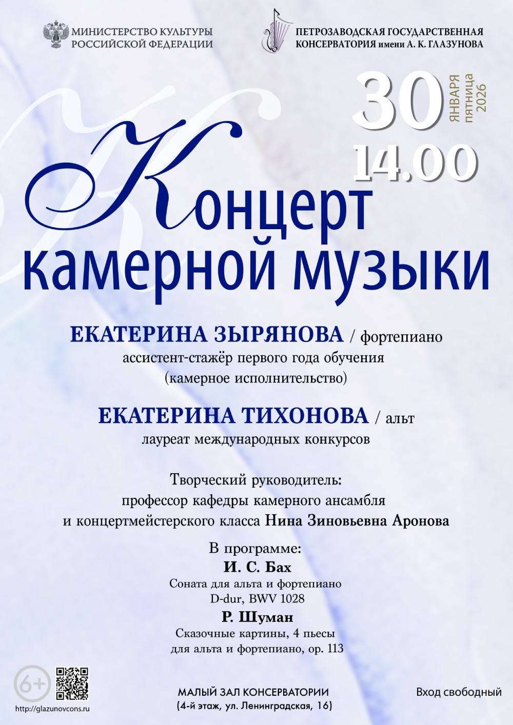 30 января в 14.00 в Малом зале консерватории (4 этаж, ул. Ленинградская, 16) состоится концерт камерной музыки.