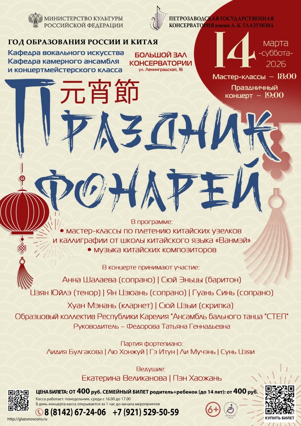 14 марта 2026 года в Большом зале консерватории состоятся мастер-классы и Праздничный концерт «Праздник фонарей».