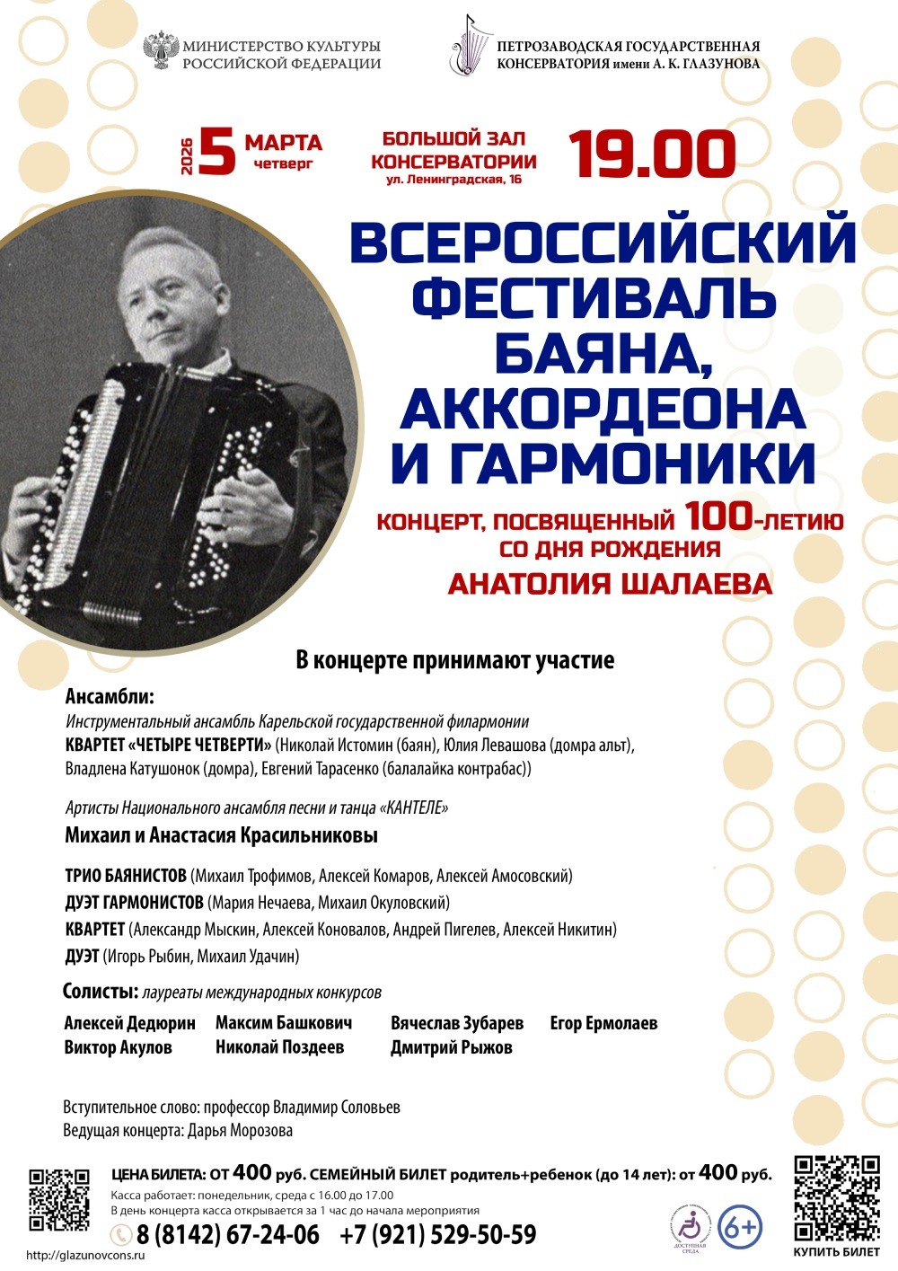 5 марта 2026 года в 19.00 в Большом зале консерватории в рамках Всероссийского фестиваля баяна, аккордеона и гармоники состоится концерт, посвященный 100-летию со дня рождения Анатолия Шалаева.