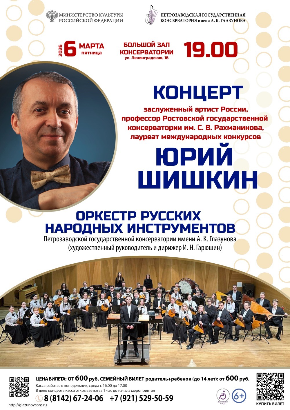 6 марта 2026 года в 19.00 в Большом зале консерватории в рамках Всероссийского фестиваля баяна, аккордеона и гармоники состоится концерт заслуженного артиста России, профессора Ростовской государственной консерватории им. С. В. Рахманинова, лауреата международных конкурсов Юрия Шишкина.