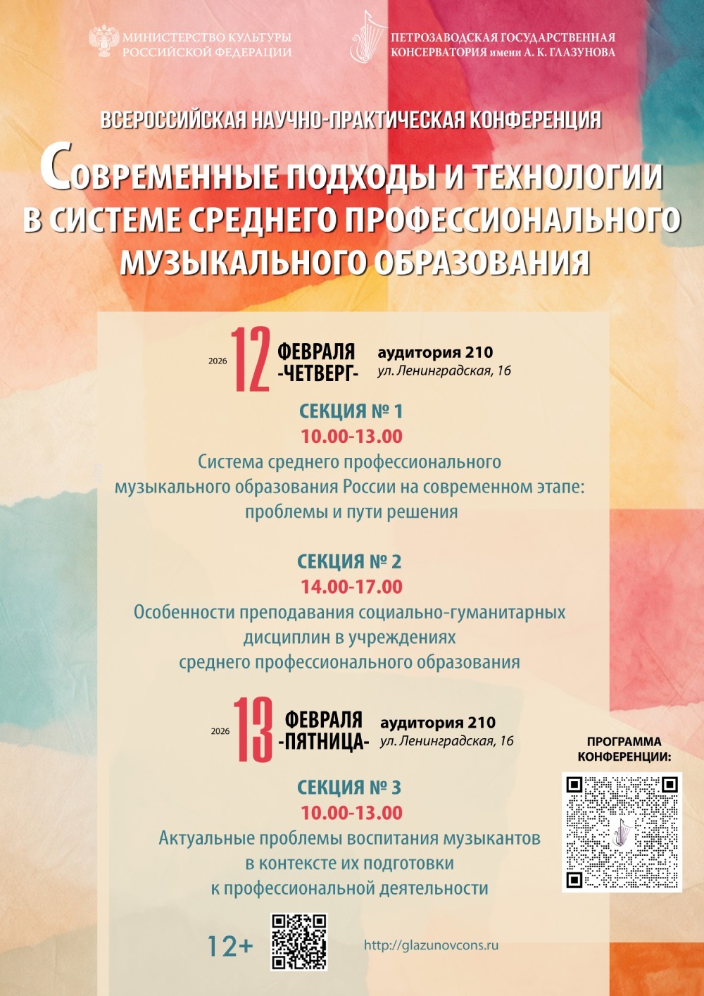 12-13 февраля 2026 года в Петрозаводской государственной консерватории имени А. К. Глазунова пройдет Всероссийская научно-практическая конференция «Современные подходы и технологии в системе среднего профессионального музыкального образования».
