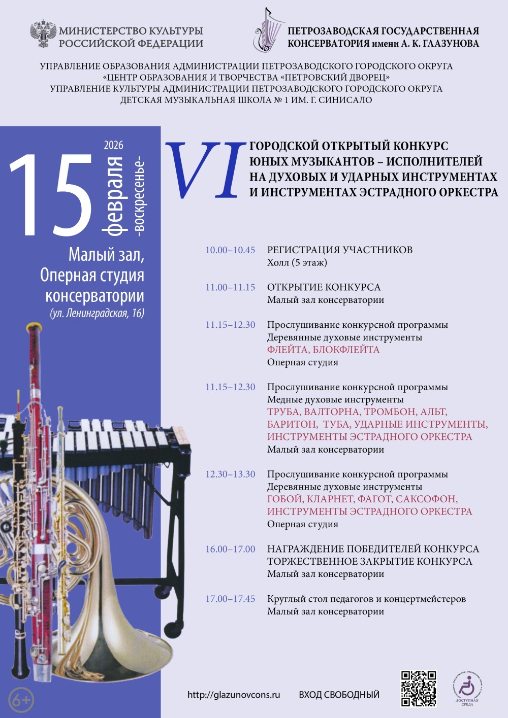 15 февраля 2026 года в Петрозаводской государственной консерватории имени А. К. Глазунова (ул. Ленинградская, 16) состоится VI Городской открытый конкурс юных музыкантов-исполнителей на духовых и ударных инструментах и инструментах эстрадного оркестра.