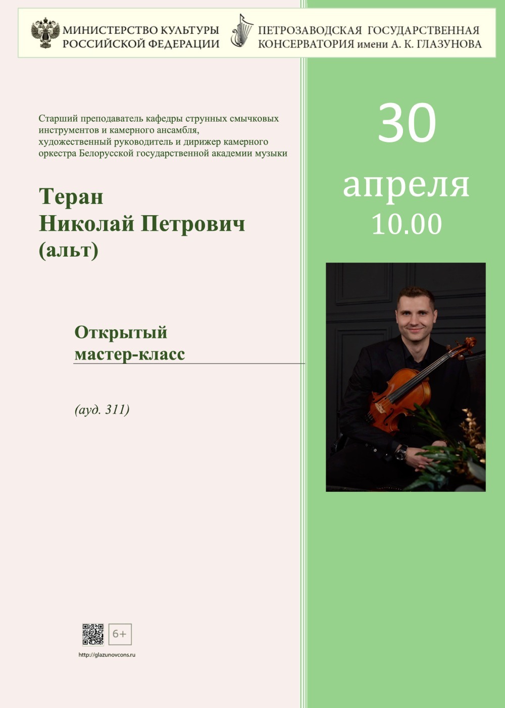30 апреля в 10.00 в аудитории №311 состоится открытый мастер-класс старшего преподавателя кафедры струнных смычковых инструментов и камерного ансамбля, художественного руководителя и дирижера камерного оркестра Белорусской государственной академии музыки Терана Николая Петровича (альт).