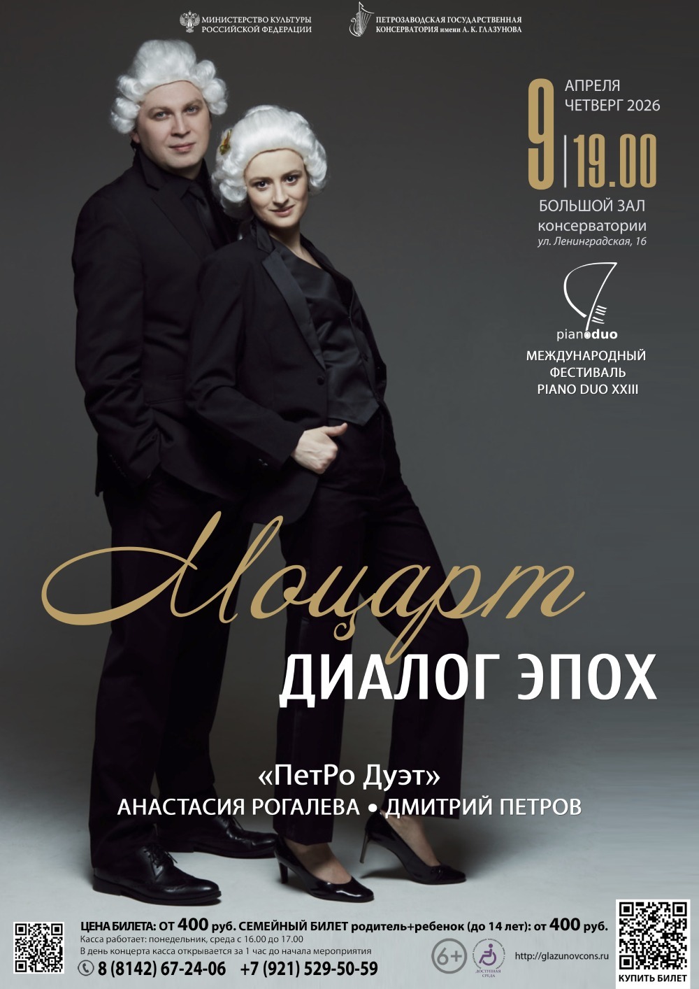 9 апреля 2026 года в 19:00 в Большом зале консерватории (ул. Ленинградская, 16) в рамках Международного фестиваля Piano Duo XXIII состоится концерт «Моцарт диалог эпох».