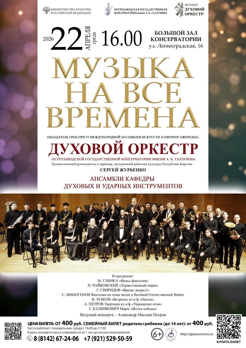 Обладатель Гран-при VI Международной Ассамблеи искусств «Северное ожерелье» духовой оркестр Петрозаводской государственной консерватории имени А. К. Глазунова (художественный руководитель и дирижер, заслуженный работник культуры Республики Карелия – Сергей Журбенко).