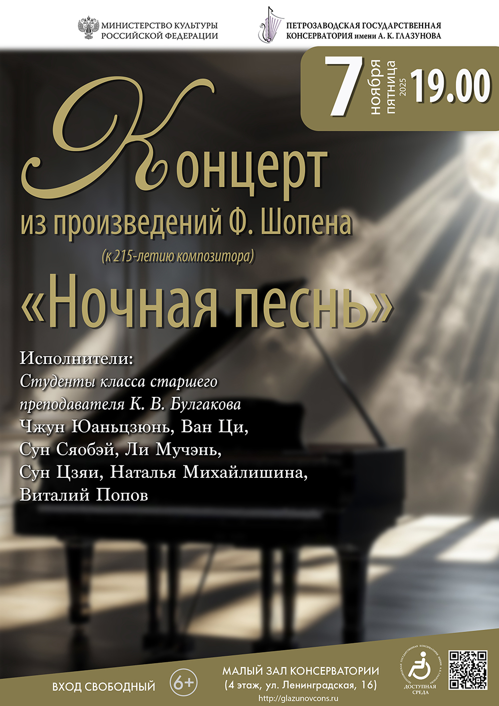 7 ноября 2025 года в 19.00 в Малом зале консерватории (ул. Ленинградская, 16, 4 этаж) состоится концерт из произведений Ф. Шопена (к 215-летию композитора) «Ночная песнь».