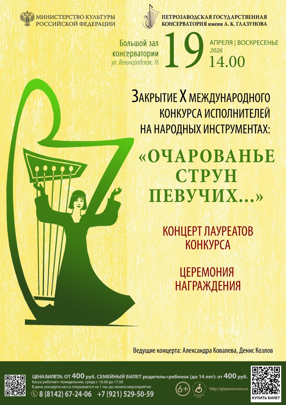 19 апреля в 14.00 в Большом зале консерватории состоится Концерт-Закрытие и церемония награждения участников X Международного конкурса исполнителей на народных инструментах: «Очарованье струн певучих...».
