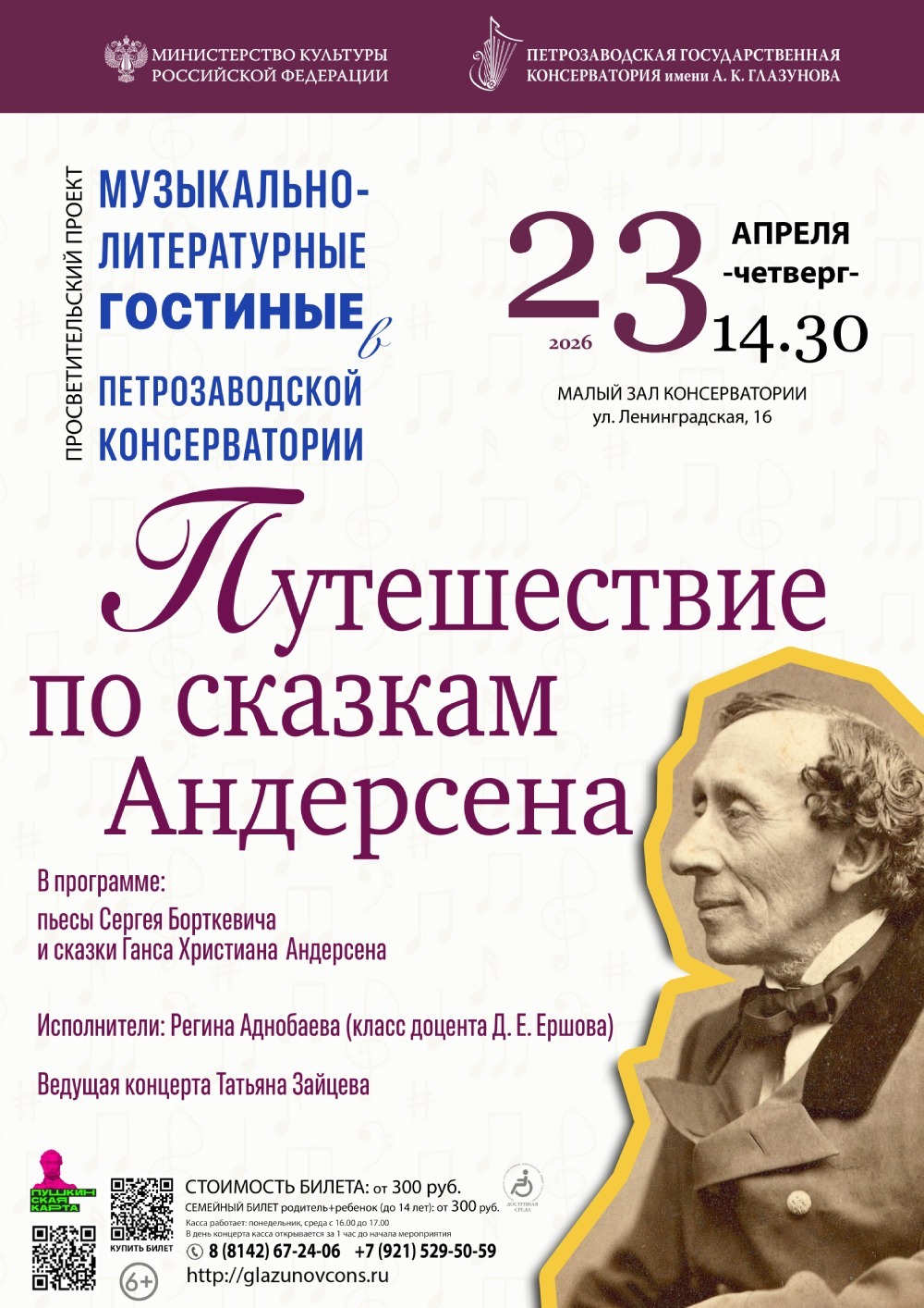 23 апреля 2026 года в 14.30 в Малом зале консерватории (ул. Ленинградская, 16, 4 этаж) в рамках просветительского проекта «Музыкально-литературные гостиные в Петрозаводской консерватории» состоится концерт «Путешествие по сказкам Андерсена».