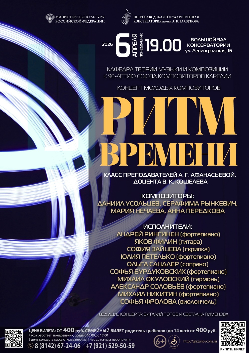 6 апреля 2026 года в 19:00 в Большом зале консерватории (ул. Ленинградская, 16) кафедра теории музыки и композиции представит концерт молодых композиторов к 90-летию Союза композиторов Карелии «РИТМ ВРЕМЕНИ».