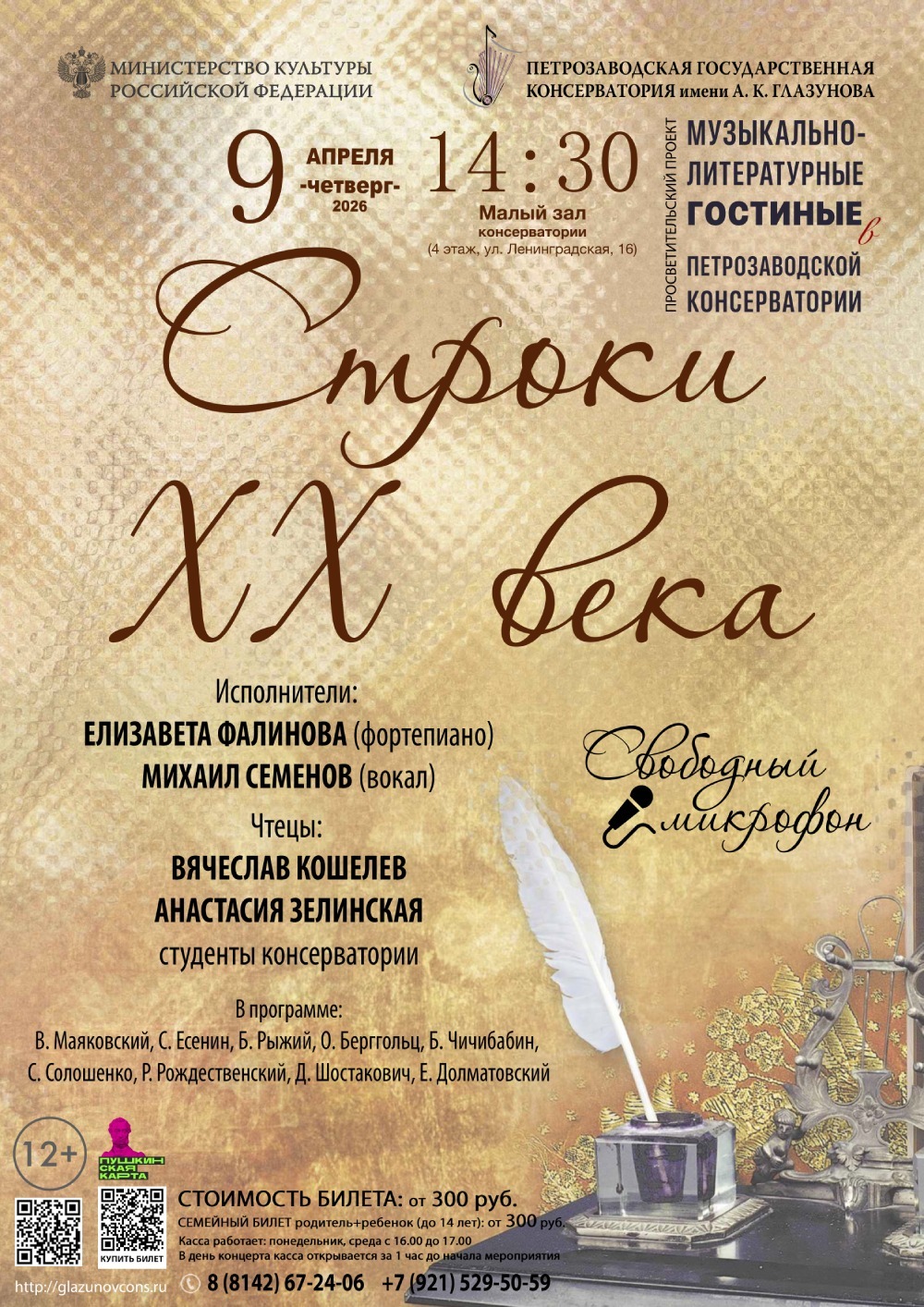 9 апреля 2026 года в 14.30 в Малом зале консерватории (ул. Ленинградская, 16, 4 этаж) в рамках просветительского проекта «Музыкально-литературные гостиные в Петрозаводской консерватории» состоится концерт «Строки XX века».