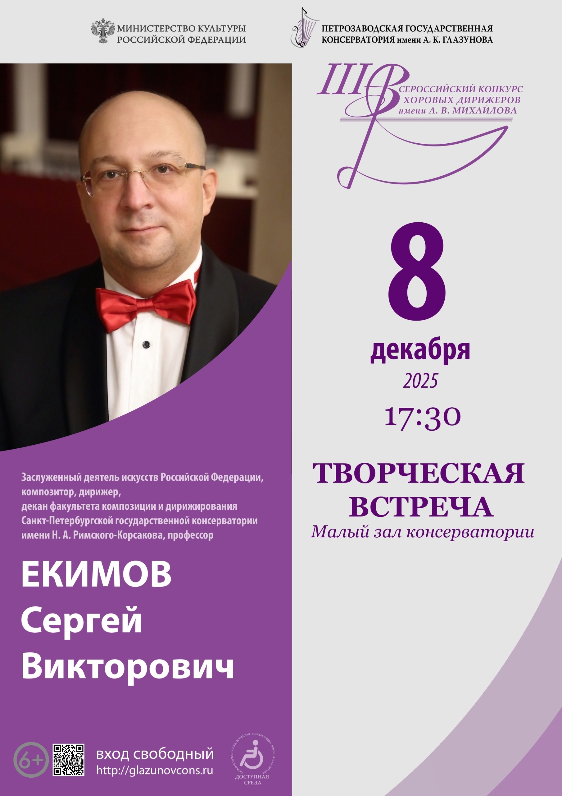 8 декабря 2025 года в 17.30 в Малом зале консерватории (ул. Ленинградская, 16, 4 этаж) пройдет творческая встреча с Сергеем Викторовичем Екимовым заслуженным деятелем искусств Российской Федерации, композитором, дирижером, деканом факультета композиции и дирижирования Санкт-Петербургской государственной консерватории имени Н.А. Римского-Корсакова, профессором.