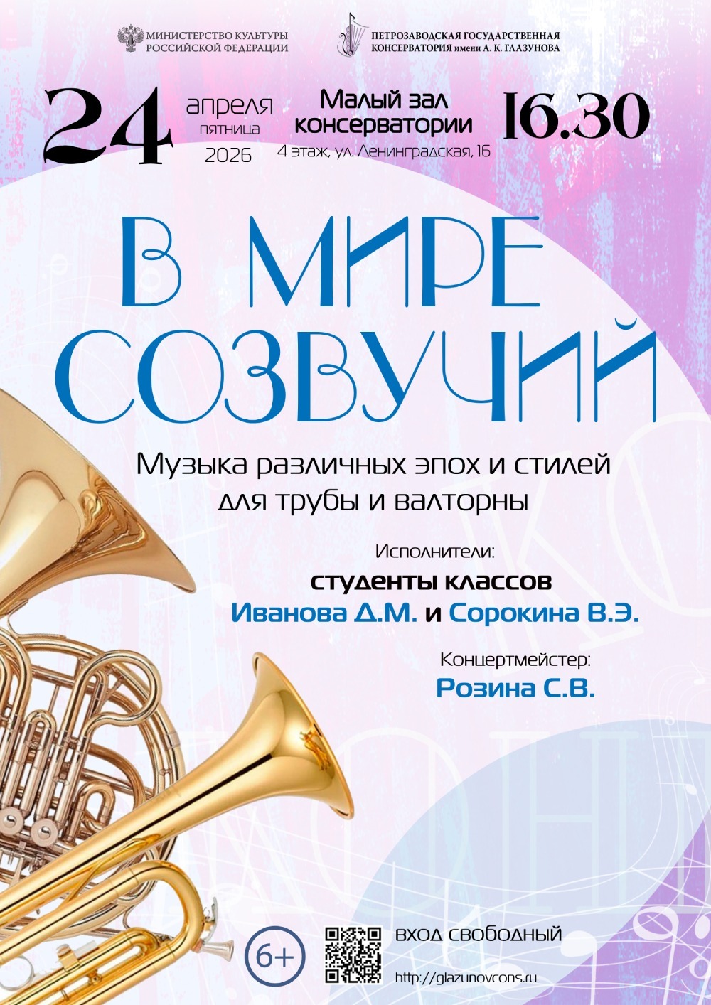 24 апреля 2026 года в 16.30 в Малом зале консерватории (ул. Ленинградская, 16, 4 этаж) состоится концерт «В мире созвучий».
