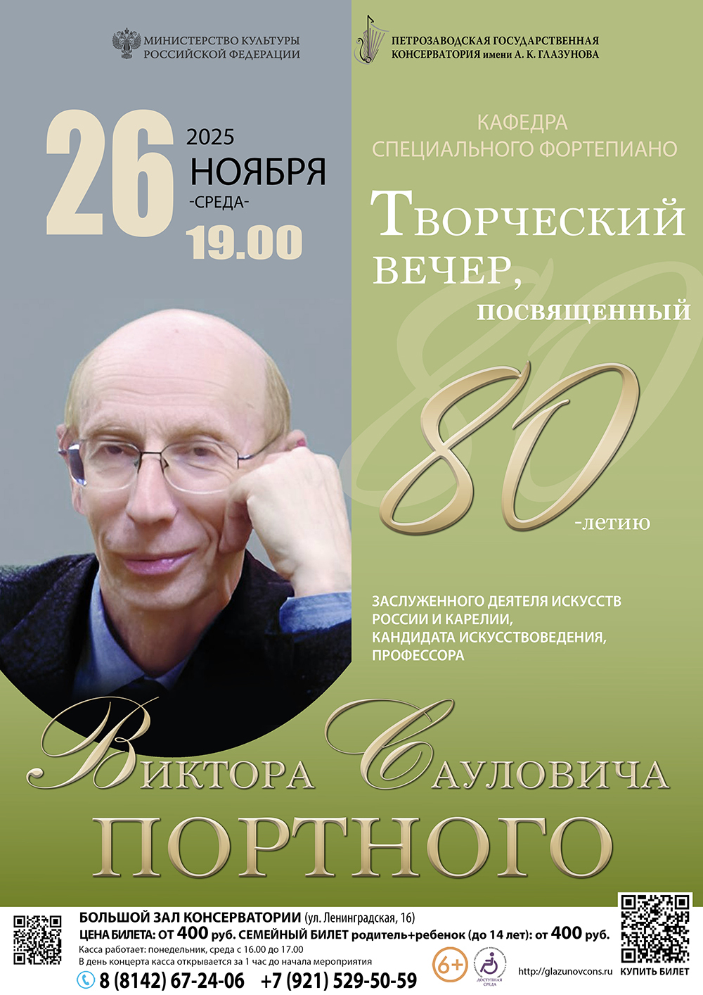 26 ноября 2025 года в 19.00 в Большом зале консерватории (ул. Ленинградская, 16) пройдет творческий вечер, посвященный 80-летию заслуженного деятеля искусств России и Карелии, кандидата искусствоведения, профессора Виктора Сауловича Портного.