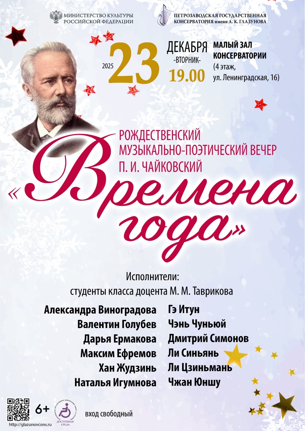 23 декабря 2025 года в 19.00 в Малом зале консерватории (4 этаж, ул. Ленинградская, 16) состоится рождественский музыкально-поэтический вечер «Времена года» П. И. Чайковский.
