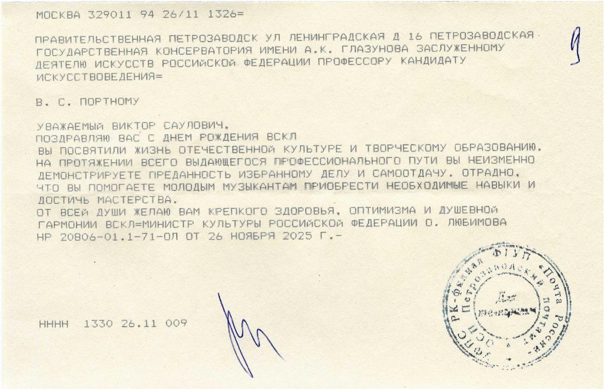 Заслуженному деятелю искусств Российской Федерации, профессору, кандидату искусствоведения В. С. Портному