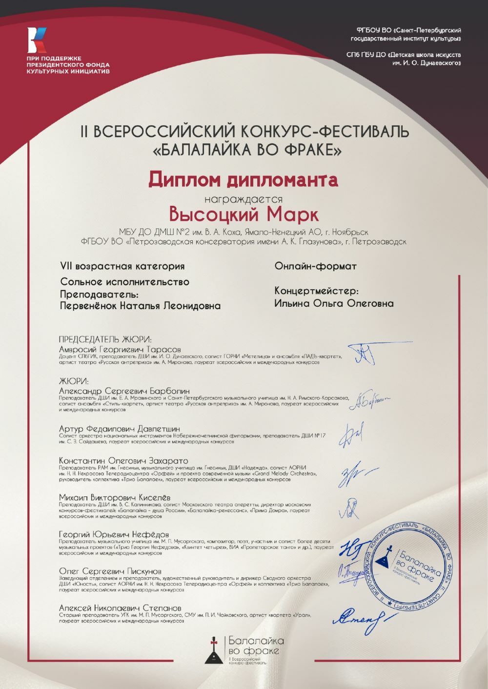 Поздравляем студента кафедры народных инструментов Петрозаводской государственной консерватории имени А.К. Глазунова Высоцкого Марка (класс доцента Первененок Н.Л.) с успешным выступлением во II Всероссийском конкурсе «Балалайка во фраке» – Дипломант в номинации «Сольное исполнительство» (г. Санкт-Петербург, ноябрь 2025)!