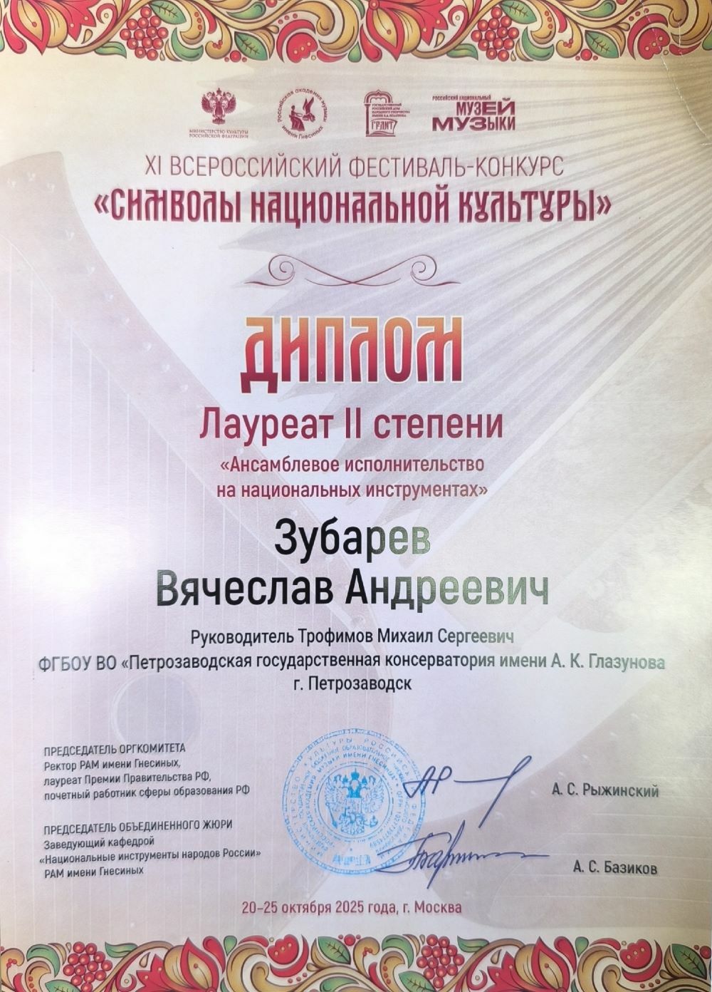 Поздравляем студента кафедры народных инструментов Петрозаводской государственной консерватории имени А.К. Глазунова Зубарева Вячеслава (класс доцента Трофимова М.С.) с успешным выступлением в ХI Всероссийском фестивале-конкурсе «Символы национальной культуры» – лауреат II степени в номинации «Ансамблевое исполнительство на национальных инструментах» (г. Москва, октябрь 2025)!