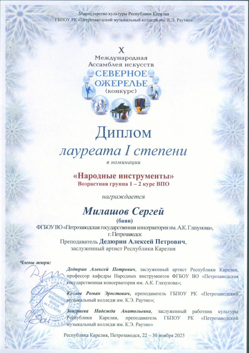 Милашов Сергей – лауреат I степени (класс профессора Дедюрина А.П.),