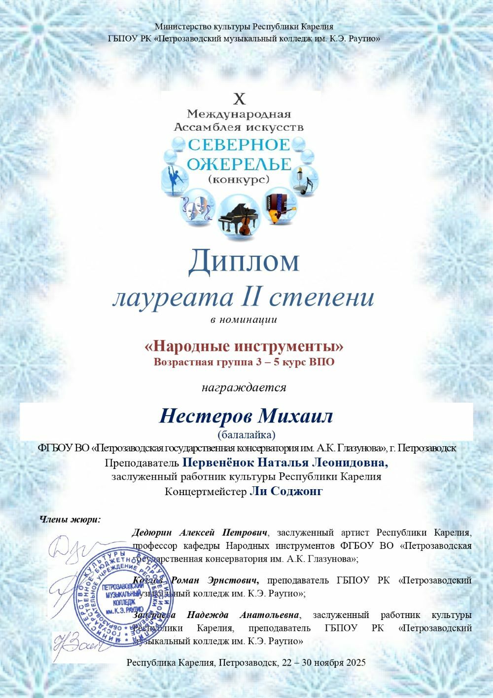Нестеров Михаил – лауреат II степени (класс доцента Первененок Н.Л.),