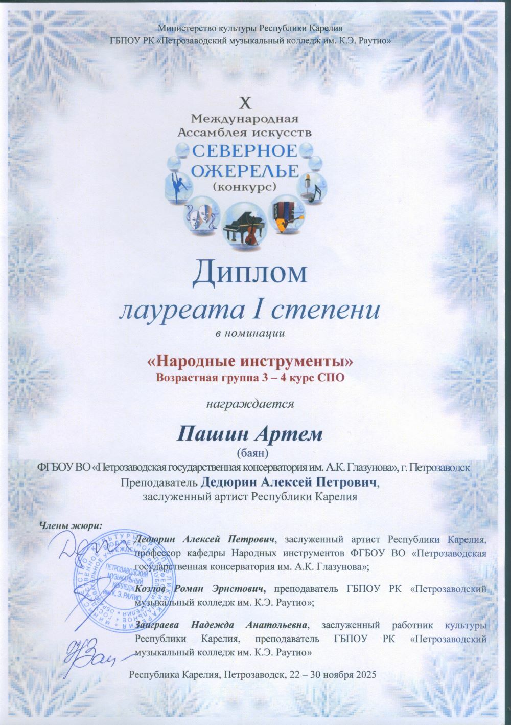 Пашин Артем – лауреат I степени (класс профессора Дедюрина А.П.),
