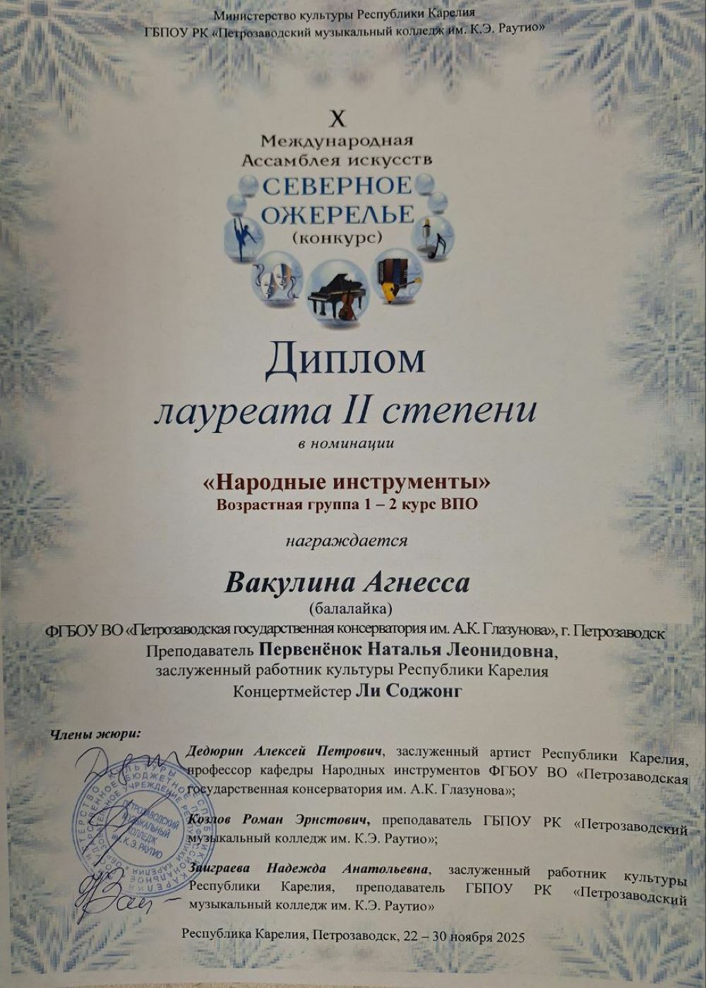 Поздравляем студентов и преподавателей кафедры народных инструментов Петрозаводской государственной консерватории имени А.К. Глазунова с успешным выступлением на X Международной Ассамблее искусств «Северное ожерелье»!